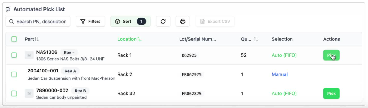 Automatically generated pick lists recommends inventory (FIFO) and order every pick by physical location. Your team spends less time searching, walking, and second-guessing—so kits hit the line faster, and WIP stays lean.